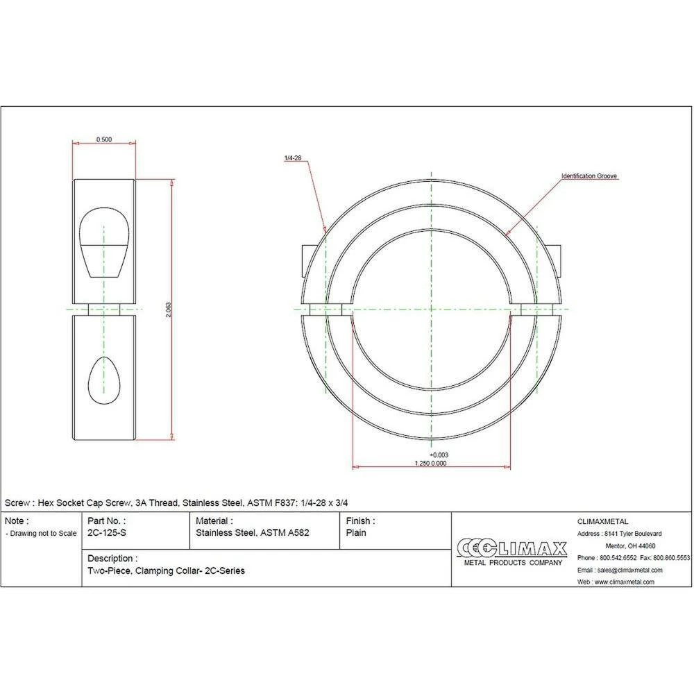 Climax Part 2C-125-S Clamping Collar is made with T303 Stainless Steel, which is effective in corrosive environments. Dimensions are 1-1/4 in. ID, 2-1/16 in. OD, 1/2 in. Width. It is effective on hard and soft shafts. The design fully engages the shaft without marring. It has a 360° clamping force.