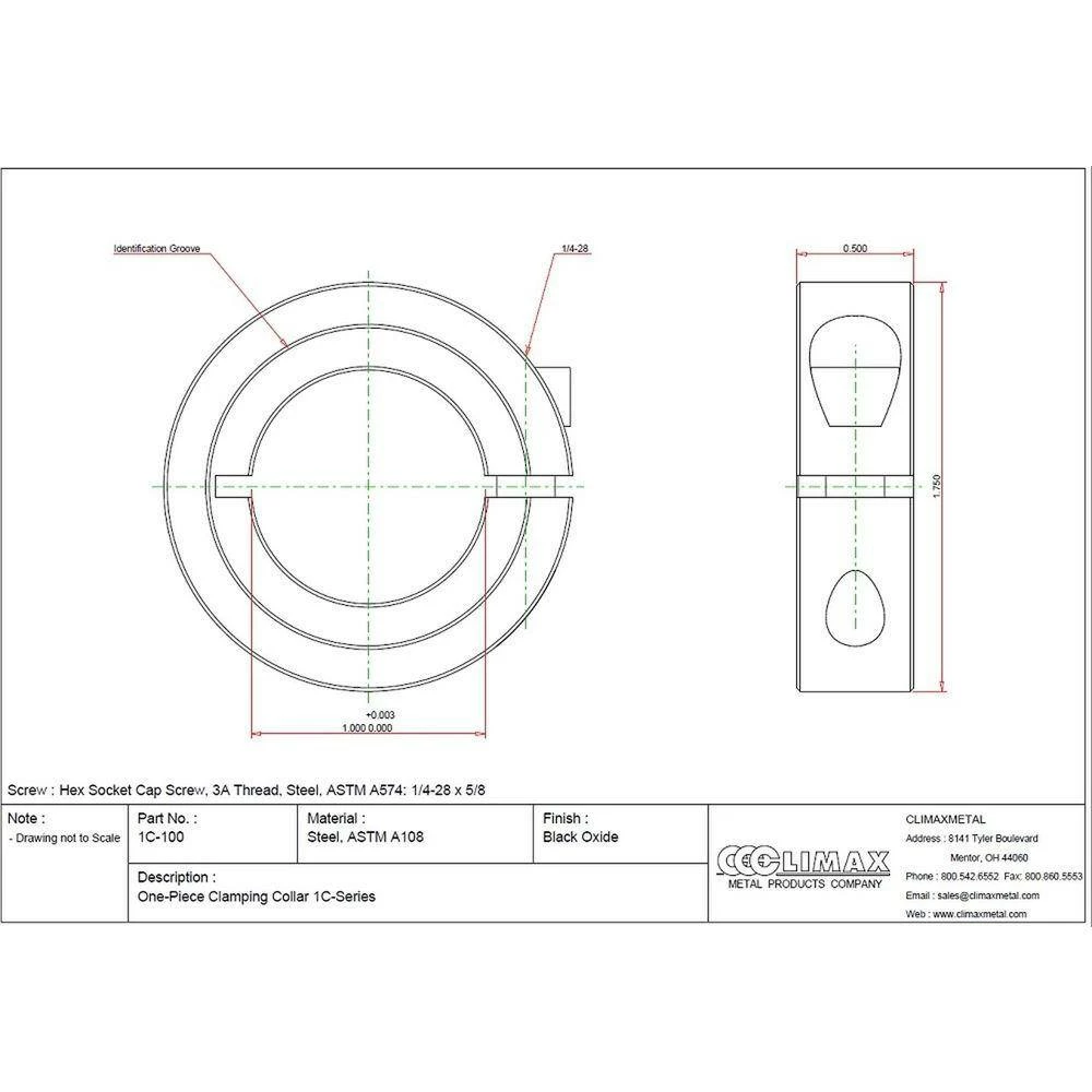 Climax Part 1C-100 Clamping Collar is made from mild steel with black oxide coating for corrosion resistance. Dimensions are 1 ID, 1 3/4 in. OD, 1/2 in. Width. It is effective on hard and soft shafts. The design fully engages the shaft without marring. It has a 360° clamping force.