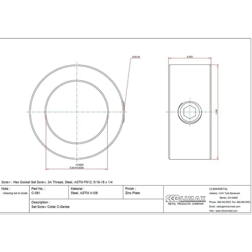 Climax Part C-081 Set Screw Collar is made from mild steel and zinc plated for corrosion resistance. Dimensions are 13/16 in. ID, 1 1/4 in. OD, 9/16 in. Width. It is effective on hard and soft shafts. It is a Cost effective collar design, and Easily installed where major disassembly would otherwise be required.