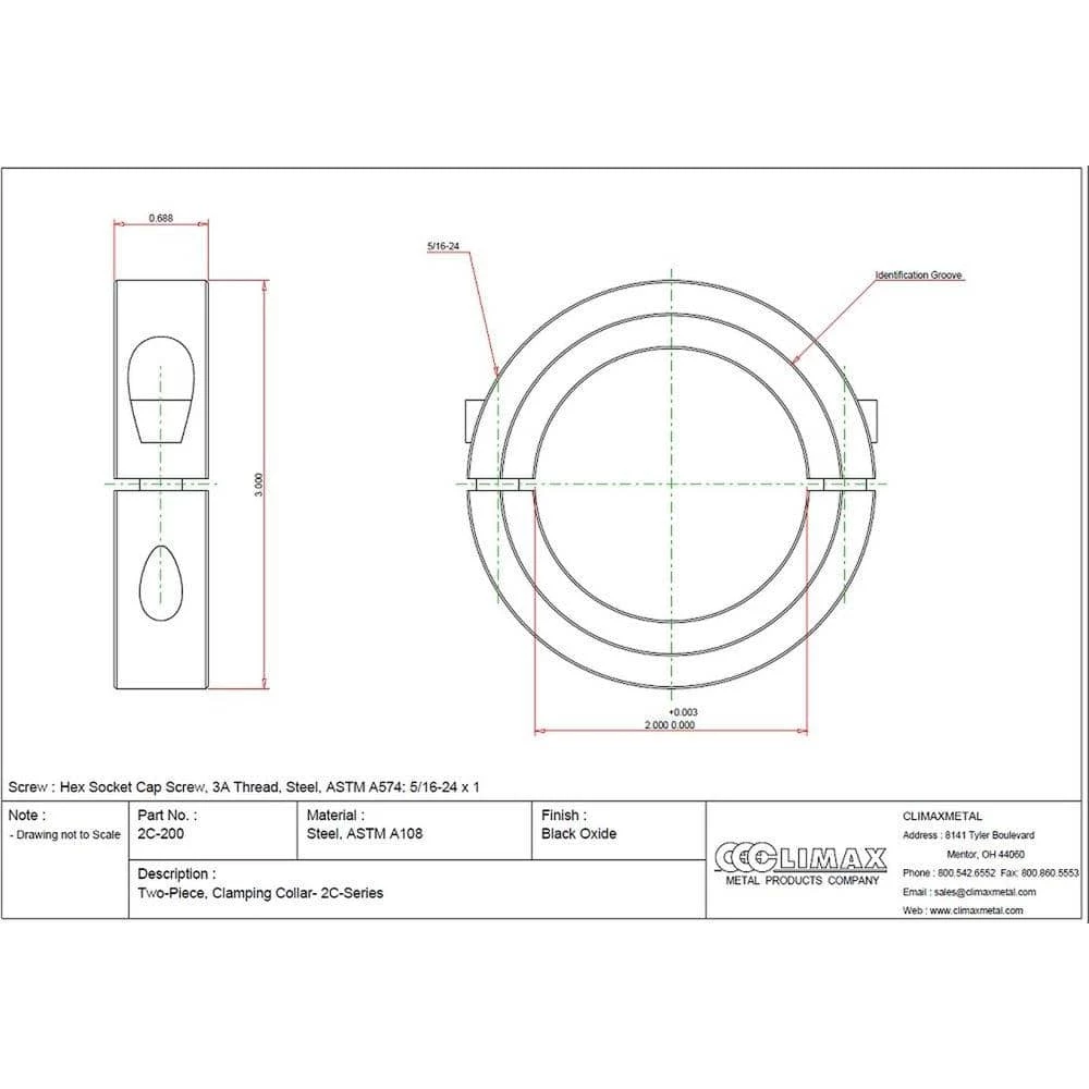 Climax Part 2C-200 Clamping Collar is made from mild steel with black oxide coating for corrosion resistance. Dimensions are 2 in. ID, 3 in. OD, 11/16 in. Width. It is effective on hard and soft shafts. The design fully engages the shaft without marring. It has a 360° clamping force.