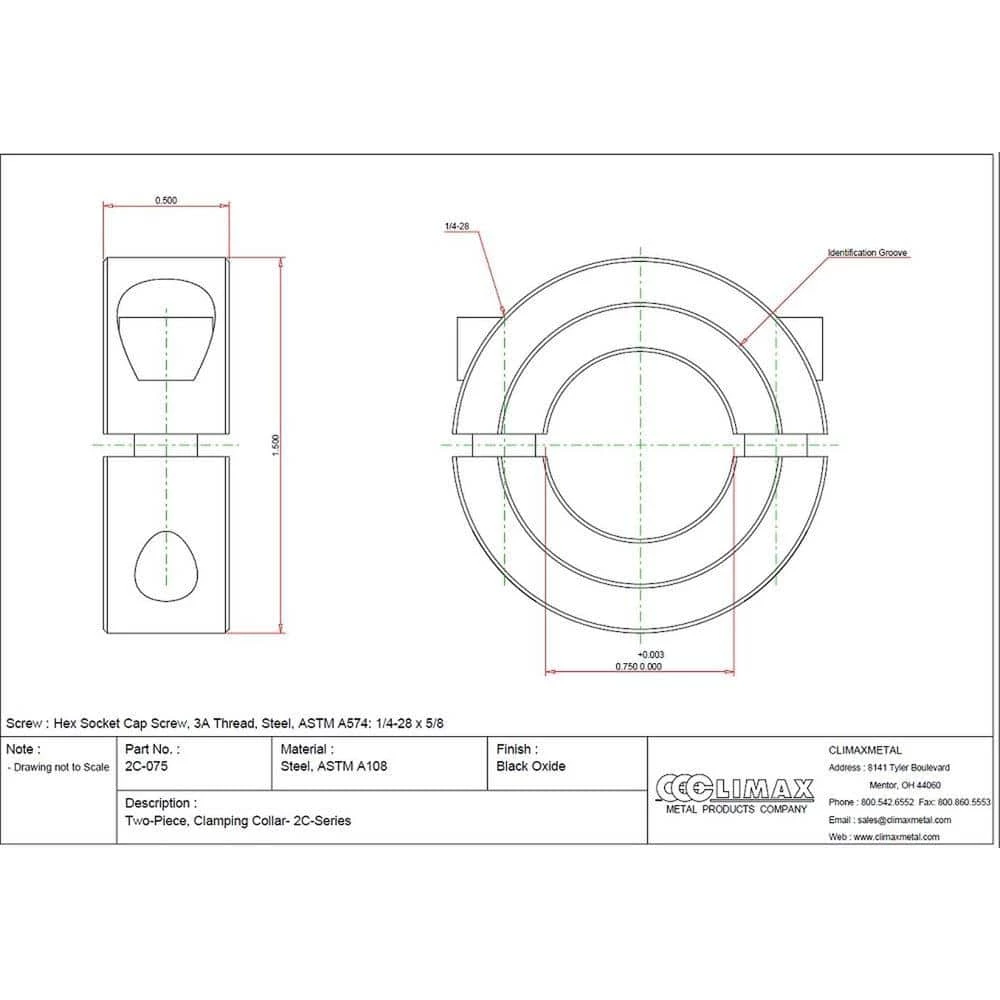 Climax Part 2C-075 Clamping Collar is made from mild steel with black oxide coating for corrosion resistance. Dimensions are 3/4 in. ID, 1-1/2 in. OD, 1/2 in. Width. It is effective on hard and soft shafts. The design fully engages the shaft without marring. It has a 360° clamping force.