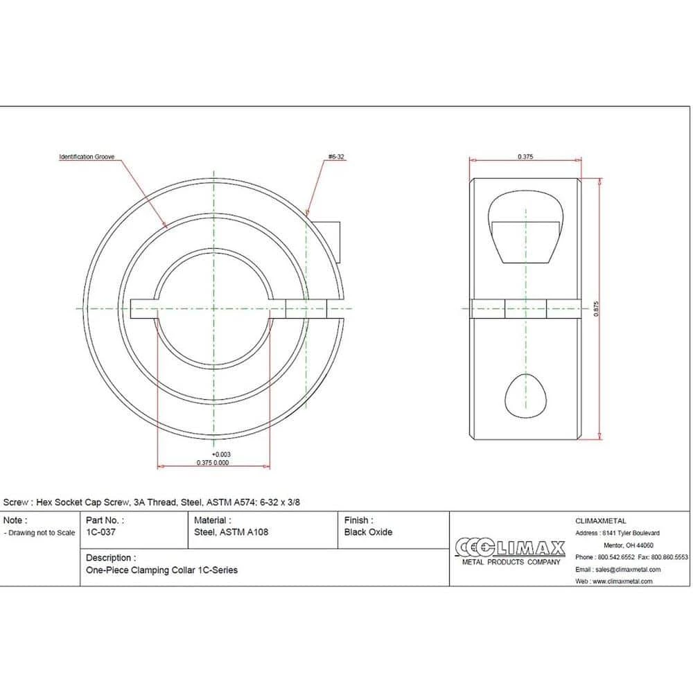 Climax Part 1C-037Clamping Collar is made from mild steel with black oxide coating for corrosion resistance. Dimensions are 3/8 in. ID, 7/8 in. OD, 3/8 in. Width. It is effective on hard and soft shafts. The design fully engages the shaft without marring. It has a 360° clamping force.