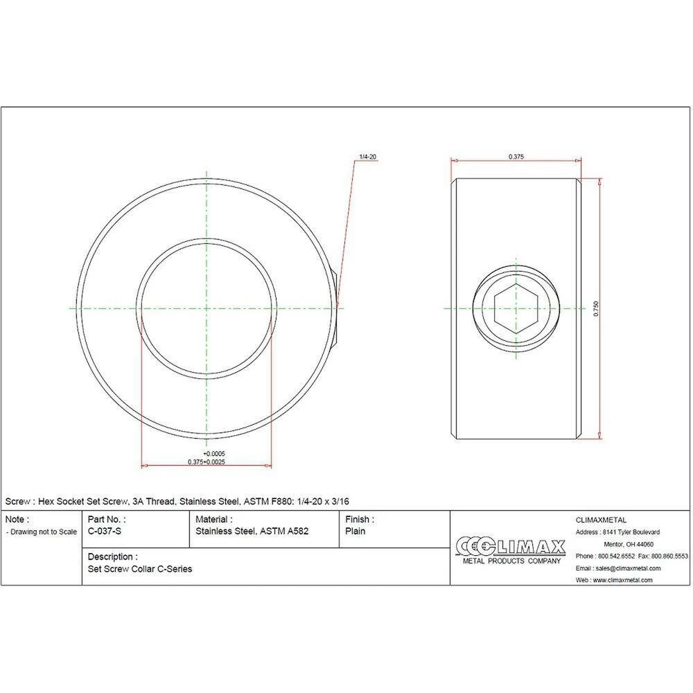 Climax Part C-037-S Set Screw Collar is made with T303 Stainless Steel, which is effective in corrosive environments. Dimensions are 3/8 in. Bore, 3/4 in. OD, 3/8 in. Width. It is effective on hard and soft shafts. It is a Cost effective collar design, and Easily installed where major disassembly would otherwise be required.