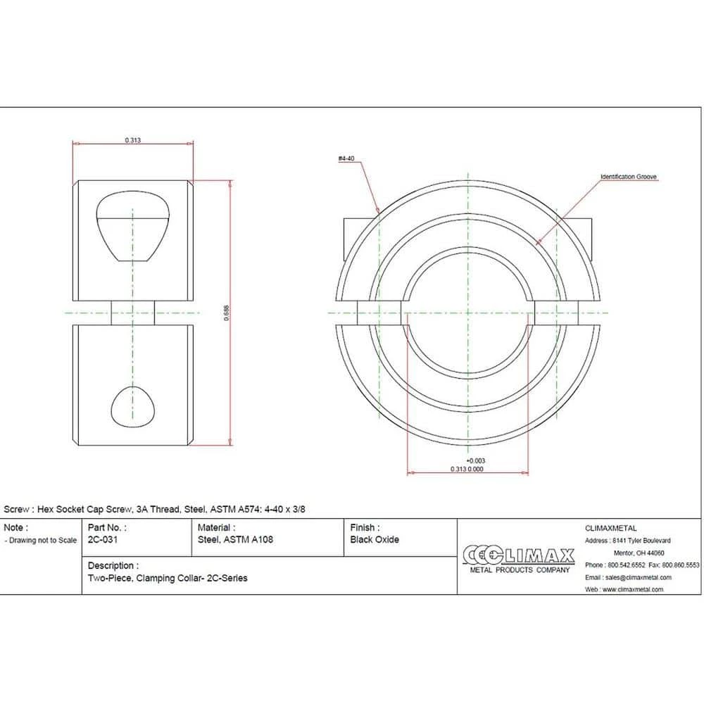 Climax Part 2C-031 Clamping Collar is made from mild steel with black oxide coating for corrosion resistance. Dimensions are 5/16 in. ID, 11/16 in. OD, 5/16 in. Width. It is effective on hard and soft shafts. The design fully engages the shaft without marring. It has a 360° clamping force.