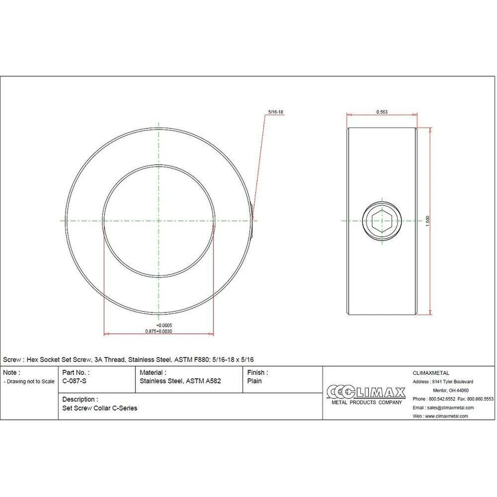 Climax Part C-087-S Set Screw Collar is made with T303 Stainless Steel, which is effective in corrosive environments. Dimensions are 7/8 in. Bore,1-1/2 in. OD,9/16 in. Width. It is effective on hard and soft shafts. It is a Cost effective collar design, and Easily installed where major disassembly would otherwise be required.