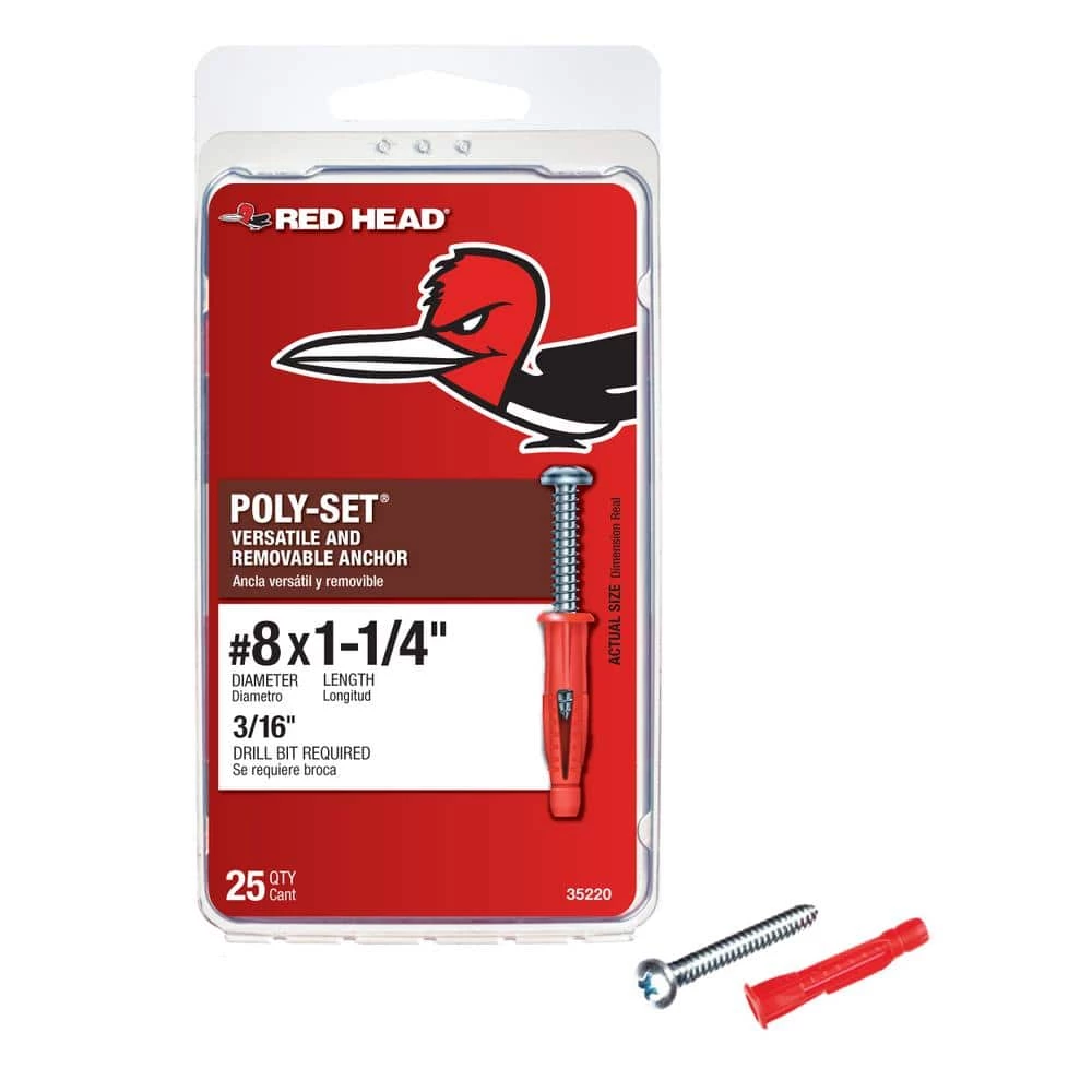 Use Red Head 1-1/4 in. Polyset Pan-Head Phillips Light-Duty Anchors with Screws (25-Pack) to attach curtain rods, shelving and other items to drywall, brick, block and concrete. The anchors come with #8 x 1-1/2 in. Phillips-head screws. Easy installation.