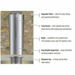 Use the Red Head 3/8 in. x 1-5/8 in. Zinc-Plated Steel Drop-In Anchor for overhead fastening in solid concrete. The anchor features steel construction and is ideal for use with threaded-rod applications. 4-way slot for dependable anchor expansion. Pre-installed plug is designed to remain in place during installation.