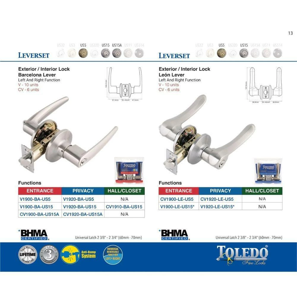 TOLEDO Fine Locks offers a well integrate combination of craftmanship and technology on their products such as the Barcelona Keyed Lever. This antique stainless steel finish keyed lever provides a few security features such as anti-bump security, anti-picking, pry resistance and compliance with ASNI Grade 3. Also, it’s a stylish lever that has universal left and right functionality and includes 3 keys.