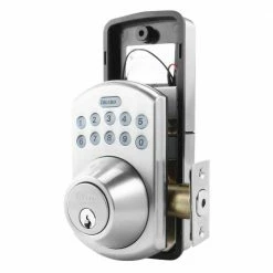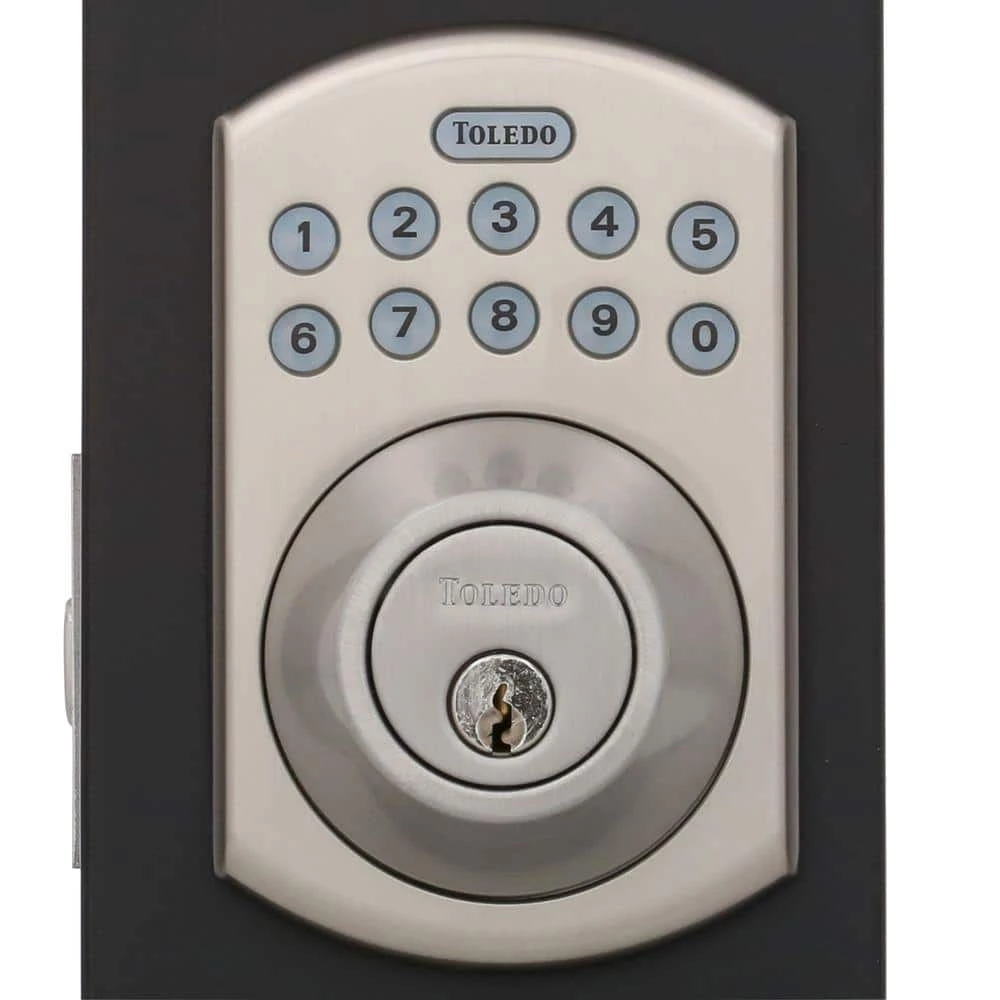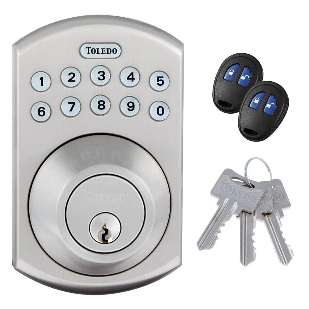 Protect your home with this Toledo electronic deadbolt. It comes with three keys and a remote control for keyless entry. Six sets of user codes give you more entry options. For safety, it offers an anti-bumping system. Steel construction makes it built to last.