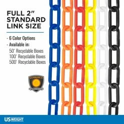 US Weight chain is produced using state of the art manufacturing and premium materials. The result is chain with a brighter, more consistent color that lasts longer. Our SunShield UV protection package is the industry leader. Made from DOW chemical’s high-density polyethylene (HDPE) gives US Weight chain superior strength and finish. HDPE is durable, safe and resistant to many common chemicals. The 2 in. link size makes for an effective visual barrier.